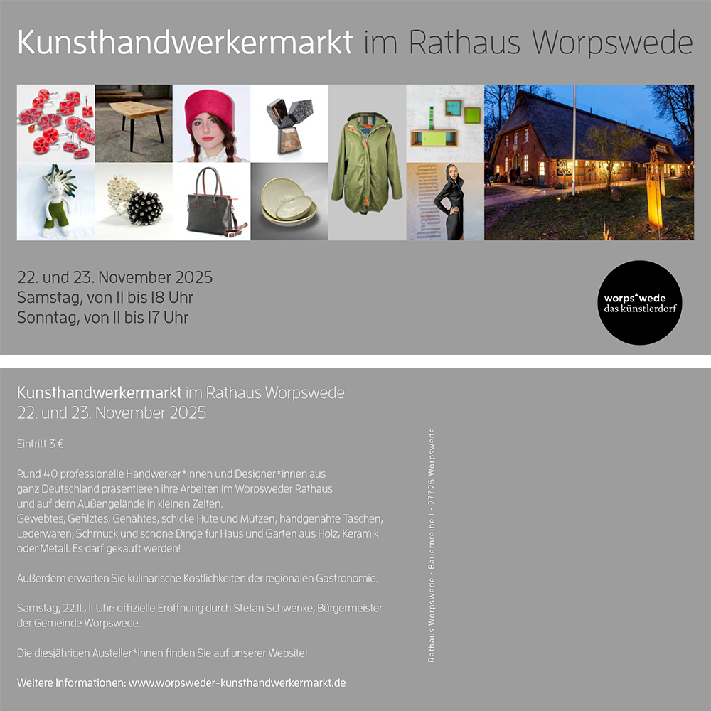 Rund 40 Kunsthandwerker:innen und Designer:innen aus ganz Deutschland präsentieren Ihre Arbeiten im Worpsweder Rathaus und auf dem Außengelände in kleinen Zelten.
